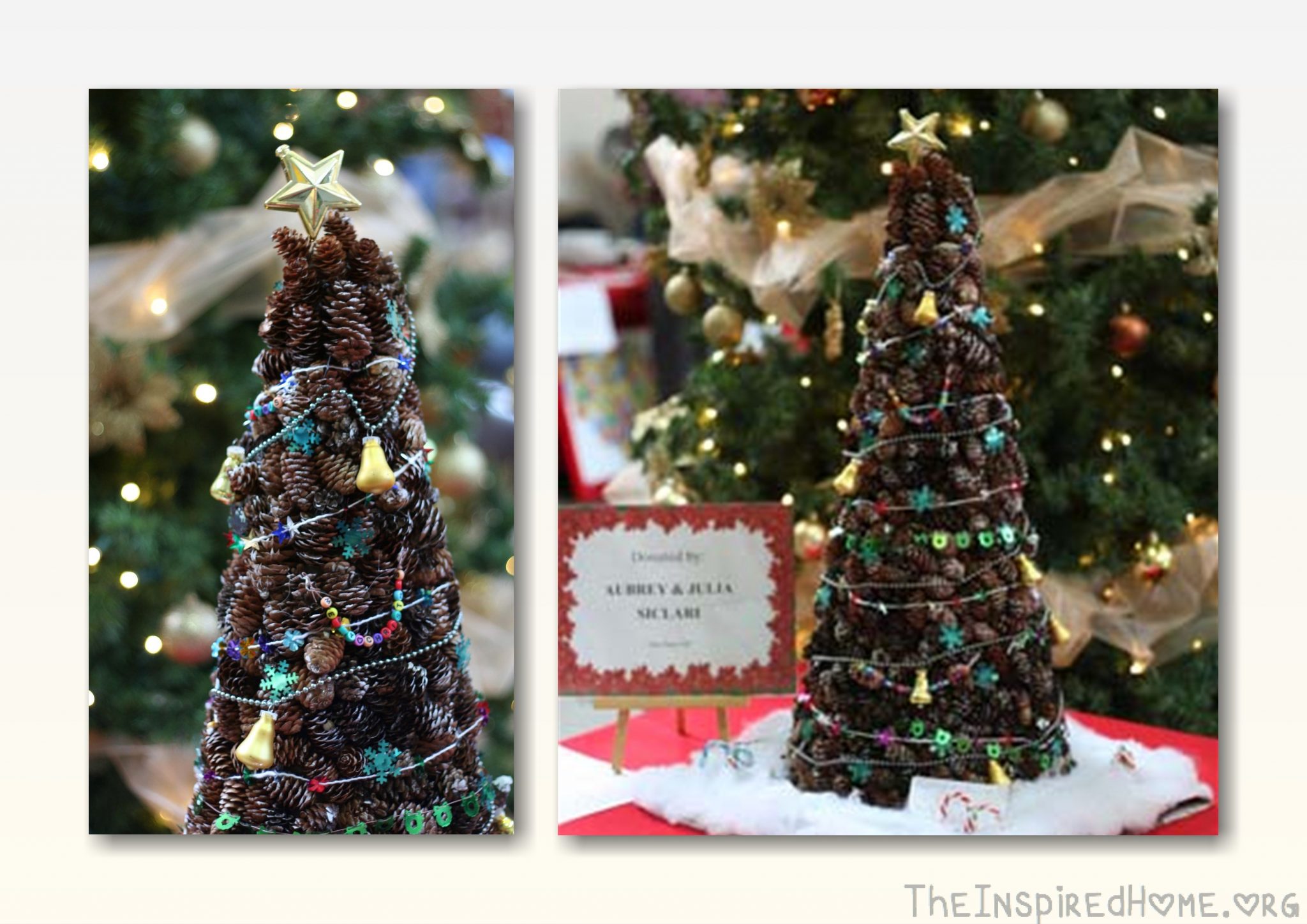 I think this is the ultimate upcycled tree using the many pine cones that litter the ground. Why not make the tree for your donation instead of having to find one? The decorations on it were quite simple but I was drawn to the texture of it and it’s crafty little spirit.